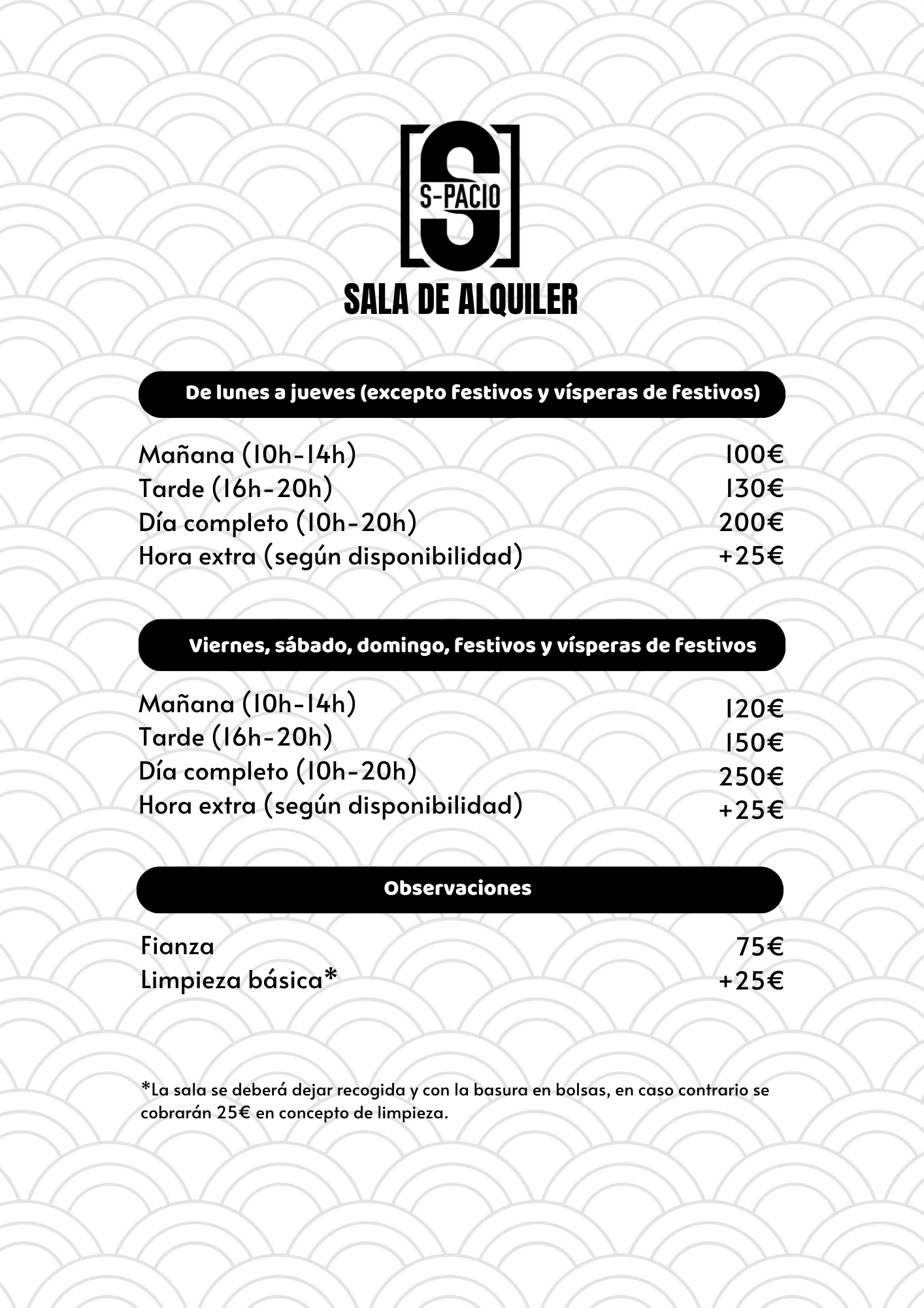 S‑PACIO es una sala de alquiler versátil y moderna en La Nucía, diseñada para acoger todo tipo de eventos: presentaciones corporativas, reuniones de trabajo, cursos y clases formativas, charlas, cumpleaños, baby showers, competiciones... ¡y mucho más! Nuestra sala de alquiler cuenta con un amplio espacio diáfano, luz natural y climatización, donde podrás adaptar fácilmente la distribución y ambiente que tu evento requiera.